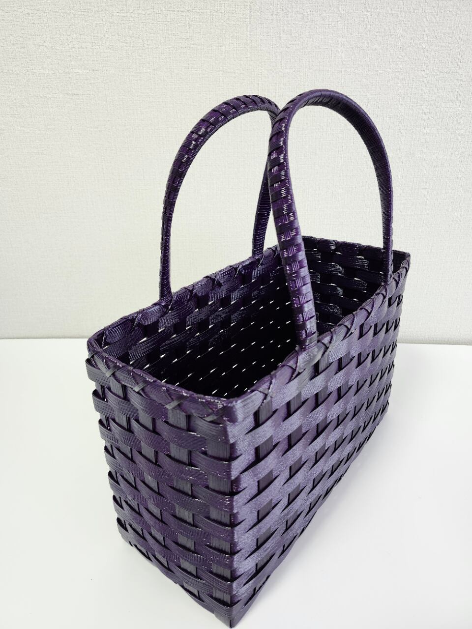 再生紙使用のクラフトバンドで、編み手さんが一つ一つ丁寧に編み上げ、山中塗りの技術を用いて塗装仕上げを施したかごバッグです。